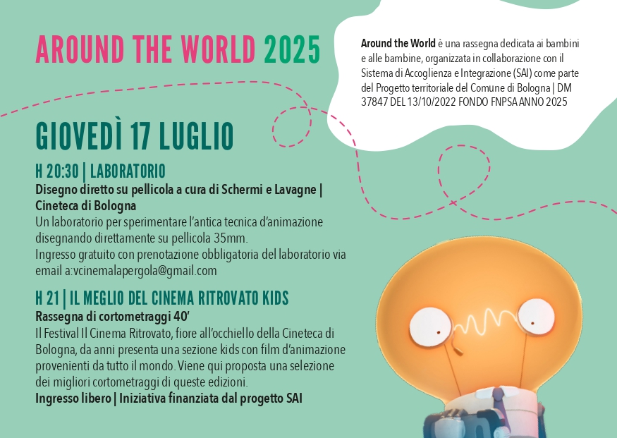 Around the World è una rassegna dedicata a bambini e bambine, organizzata in collaborazione con il Sistema di Accoglienza e Integrazione (SAI/Progetto territoriale del Comune di Bologna, coordinato da ASP Città di Bologna), il Centro di Accoglienza Straordinario di Vidiciatico e il Cinema Teatro La Pergola di Vidiciatico.